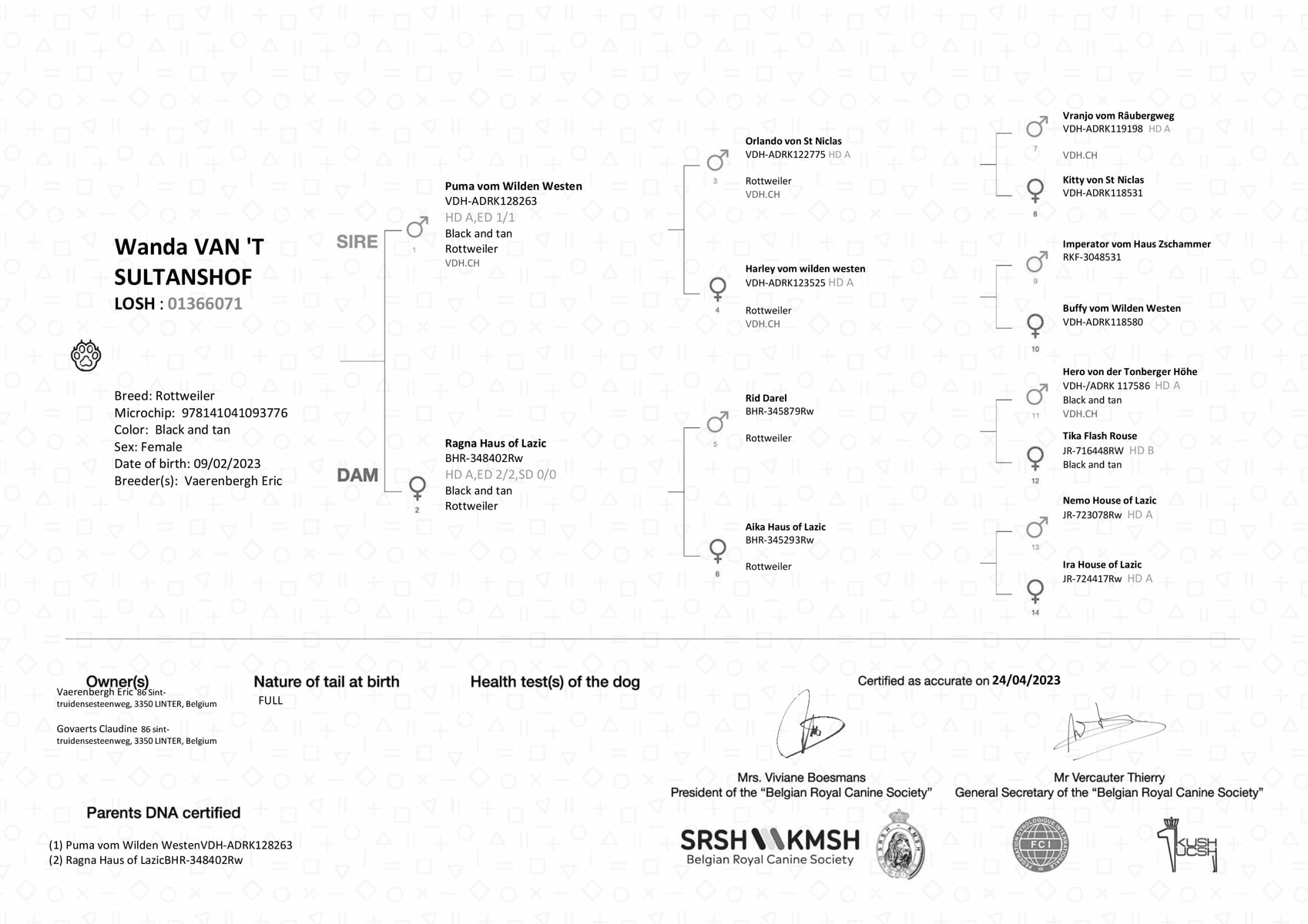 DOB: 9 February 2023Vader - Sire:Puma vom Wilden WestenMoeder - Dam:Ragna Haus of LazicHD:AED:0/0DM exon2 : N/N JLPP: N/N NAD: N/N LEMP: N/N XL-MTM : N/NL/L